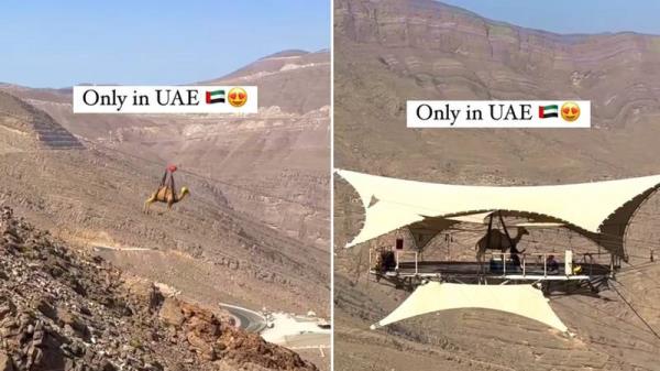一段视频在哈伊马角(Ras Al Khaimah)疯传,视频显示一只骆驼在世界上最长的索道上行走。