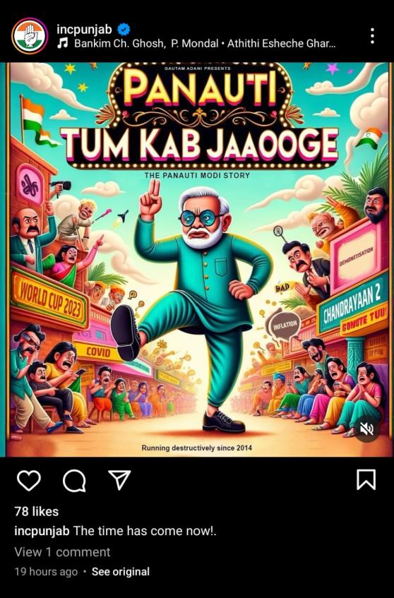 公司的旁遮普部门 国大党也在他们的Instagram账号上分享了一张类似的海报,并用旁遮普语写道:“现在是时候了。”在海报中,一幅酷似莫迪总理的漫画正在跳舞,背景中有几幅画提到了莫迪 印度过去几年面临的悲剧包括COVID-19大流行、月船2号、2023年世界杯决赛和废钞令。