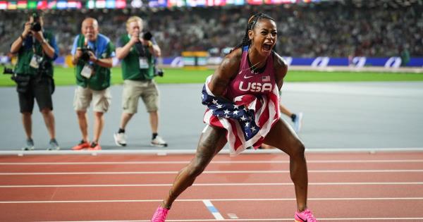 新冠军冲过终点线后显得很震惊。她向天空飞吻了一下,把目光投向漂亮的计分板,然后迷迷乎乎地走向看台,接受美国国旗和来自弗雷泽-普赖斯、英国选手蒂娜·阿舍尔-史密斯等人的祝贺。