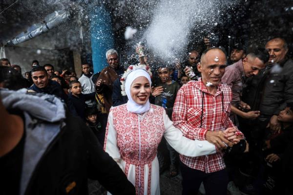 这座城市每天都遭受以色列的轰炸,新娘和新郎的家人都是成千上万逃离战火的巴勒斯坦人中的一员。