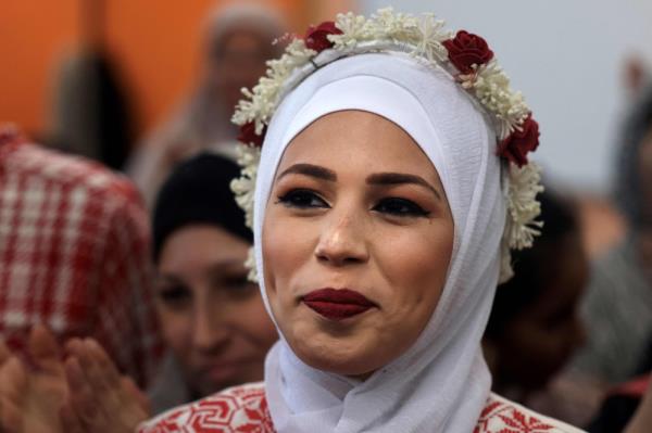 巴勒斯坦领土拉法:在家人和朋友的包围下,鼓掌和欢呼,加沙妇女Afnan Jibril在她的婚礼当天绽放出灿烂的笑容,即使战争肆虐,她也决心庆祝。