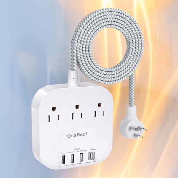 这个多功能 脐带也是一样的 虽然很方便。用它来插入灯或其他物品以及你的科技设备。你可以用5英尺的绳子或10英尺的绳子来钩住其中一个,这取决于你需要多长。它有四个USB接口,一个USB- c接口和三个交流插座。它几乎有你需要的一切,为你的宿舍供电。这种低调的扁平插头不会伸到家具上,也不会从墙上的插座上伸出来,所以你也有空间把其他东西插到插座上。