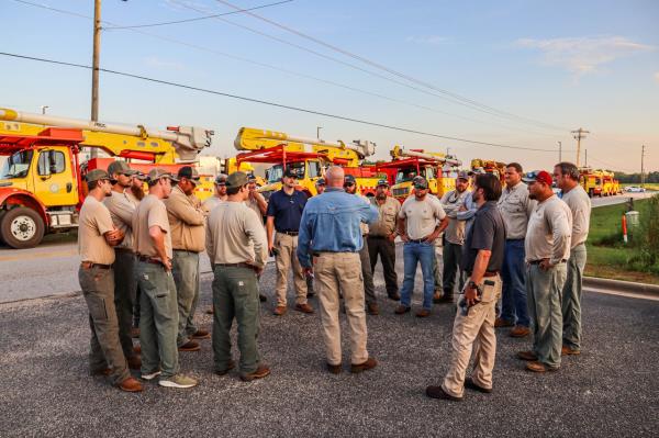 周二早些时候,在里维埃拉公用事业公司,21名工作人员聚集在洛克斯利的一个卡车站外,前往佛罗里达州的盖恩斯维尔。船员将协助盖恩斯维尔地区公用事业公司进行修复工作。据发言人莉莉·杰克逊(Lily Jackson)说,机组人员包括电线工人、工程协调员和植被管理人员。