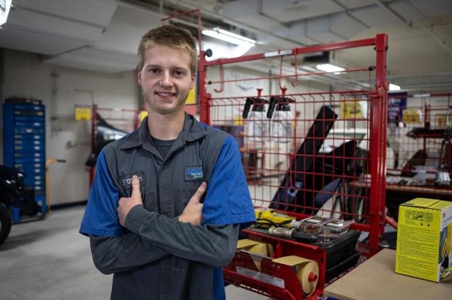 18岁的布兰登·麦卡利(Brandon McCulley)下班后直接来到了湖岸技术学院(lakesshore Technical College)的汽车教室,他仍然穿着印有他工作的汽车经销店名称的灰色制服。他正在学习汽车碰撞修理和修补证书,每周大约来两天练习他的技能,尽管不需要出勤。“我想要努力做到这一点。你必须全身心投入,”他站在汽车实验室的一个工作站旁边说。