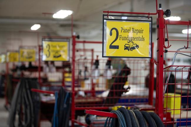 课程包括32项技能,每一项都对应于汽车商店的不同位置,就像一系列的厨房岛。每个工作站都配有供学生使用的工具和一张层压纸,详细说明了所需的技能以及如何掌握它。