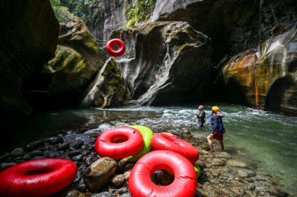 但如今,游客们乘着五彩缤纷的充气气球,伴着鸟鸣声和奔涌的流水,高高兴兴地往下跳。