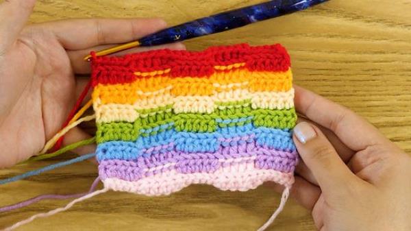 2 使用回环增加尺寸的针。钩针编织到回圈也创建一个可见的脊在你的钩针项目,所以这是一个伟大的方式来增加一个项目的兴趣。如果你想让你的针脚看起来更突出,或者如果你想加强不同颜色行之间的区分,那么做一个回圈行。例如,如果你正在用波浪图案钩织毯子,那么你可以在每次改变颜色时做一个回圈行,使波浪看起来更突出。这将给他们一个3d效果。