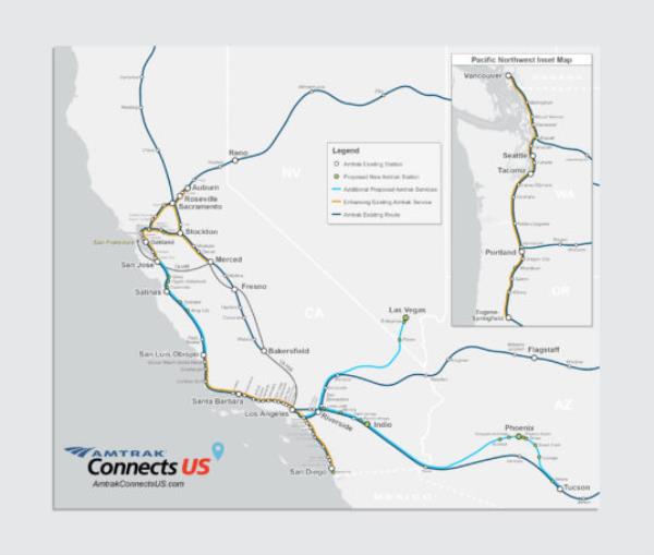 加州一直在谈论改善客运铁路。大量的项目正在规划阶段,包括一条从洛杉矶到科切拉山谷的新路线,尽管目前还不清楚哪条路线会推进,也不清楚什么时候会推进。近期最显著的改进可能包括增加热门的洛杉矶至圣地亚哥航线的服务。连接圣何塞和东湾到中央山谷的阿尔塔蒙特走廊快车目前正在延伸到默塞德,在那里它将提供到加州高速铁路初始段的中转。国会走廊服务刚刚赢得了一笔联邦拨款,以增加从萨克拉门托到其北部郊区的服务。