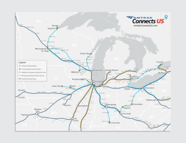 到2026年,明尼苏达州将扩大圣保罗和芝加哥之间的服务,并正在研究更重大的升级,这将大大提高走廊的速度和频率。这也将导致威斯康星州的服务得到加强。随着民主党在州议会的三连胜,明尼苏达州立法机构今年拨款开始开发北极光快车,这是一条连接双子城和德卢斯的新路线。