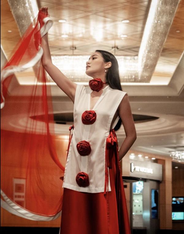 红白相间的旗袍不仅是一件美丽的可穿戴艺术品,它还旨在讲述一个强大的故事,讲述那些没有被暴力束缚的强大女性。