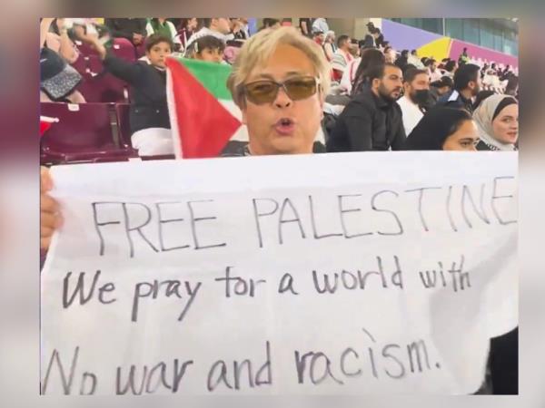 有人看到他举着一条横幅,上面写着:“解放巴勒斯坦——我们祈祷一个没有战争和种族主义的世界。”