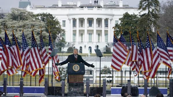 2021年1月6日,美国总统特朗普在华盛顿的一次集会上发表讲话,背景是白宫。