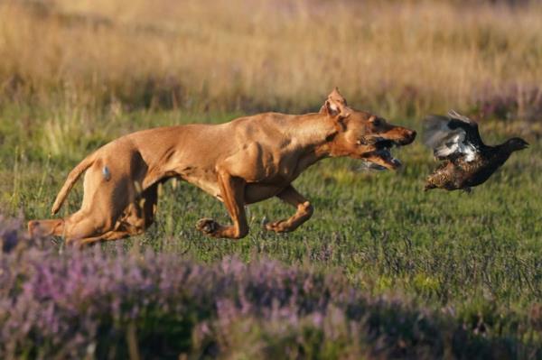 一只狗冲过石南荒原,把一只红松鸡赶跑到空中。一声枪响,鸟儿倒地而死。狗嘴里叼着猎物,快步跑回猎人身边。