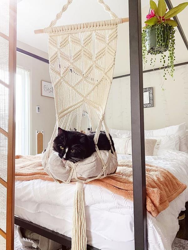 挂着的编织猫床,这样你的波西米亚主题就不会被闲逛的猫咪打扰了。这包括挂它所需的所有硬件,编织衣架和靠垫。