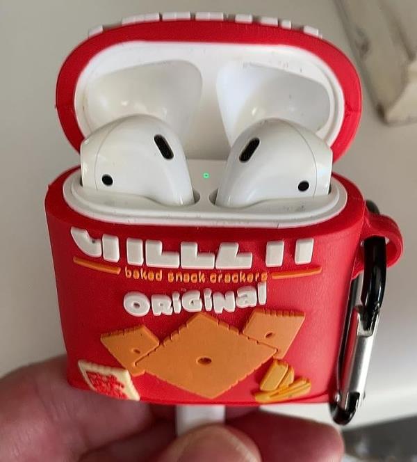 它们用耐用的橡胶防震外壳保护我的AirPods机壳。我已经收到了很多赞美,说我的箱子很可爱、很酷、很有趣。大买!”——艾迪