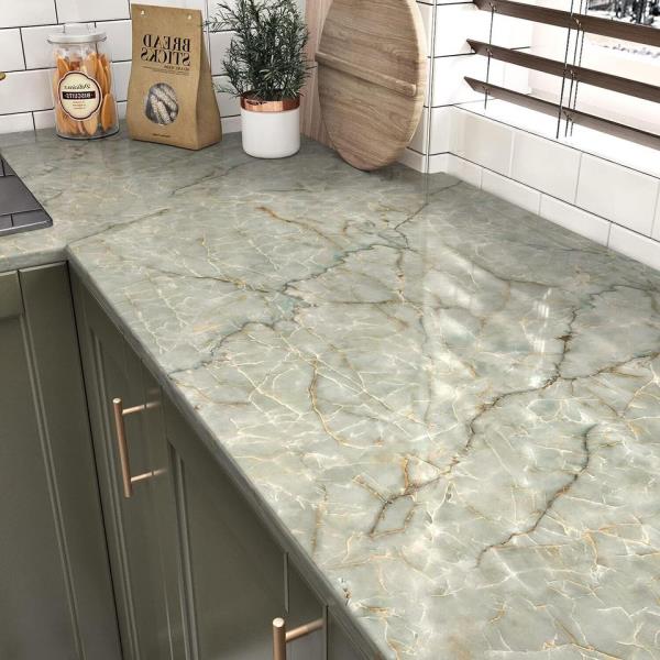 我所有的水槽上都有接触纸。这款绿色大理石风格的纸是廉价和多功能的代名词