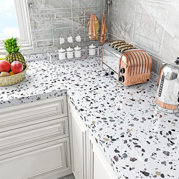 防水水磨石风格的纸张,一个预算友好的柜台处理照亮你的柜台,而不是完全白色的防水水磨石风格的纸张
