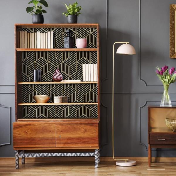接触。金色的口音是超级现代和有趣的,同时仍然优雅,不太压倒性的眼睛。这种纸很适合放在书架、壁橱或大衣橱的后面,让你的空间瞬间变得有格调