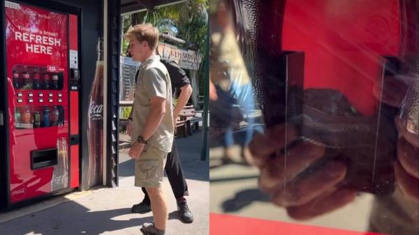 著名动物园管理员史蒂夫·欧文的儿子罗伯特·欧文在Instagram上分享的一段视频显示,一条巨大的地毯蟒在澳大利亚动物园的自动售货机里“厚脸皮地打盹”。