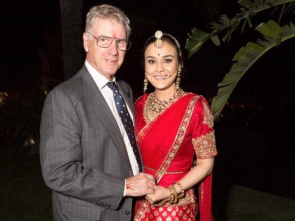 Preity Zinta在她的官方Instagram账号上分享了一张她和公公John Swindle的合影。在这张照片中,这位女演员拿着粉红色的lehenga。Preeti带着与lehenga相配的沉重珠宝,看起来就像一个新娘,她的公公牵着她的手站在一起。