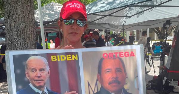 她举着一张海报,上面是拜登与卡斯特罗、委内瑞拉总统尼古拉斯·马杜罗和尼加拉瓜总统丹尼尔·奥尔特加在一起的照片。几十年来,这些左翼领导人关押反对派,导致移民涌入南佛罗里达。