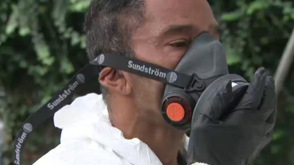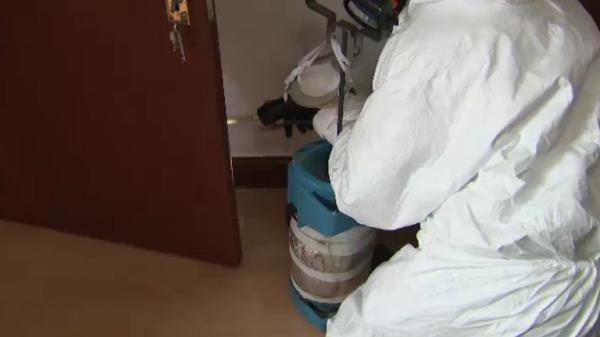 当他在这个空房间的角落喷洒杀虫剂时,蒂勒解释说,50%的臭虫来自房主:“我们可以给它一个很好的喷雾,但我们总是说,你必须打扫房间,用非常热的洗衣机洗所有的衣服。