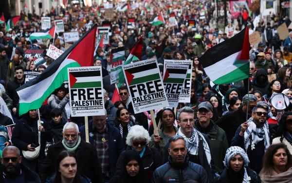 数千条横幅上写着“解放巴勒斯坦”和“停止轰炸”。一些组织者手持扩音器,高喊着布雷弗曼最近几周试图阻止的口号——“从河流到海洋,巴勒斯坦将获得自由”——并以此作为辩护的论据,根据部长的说法,亲巴勒斯坦的抗议活动实际上是煽动仇恨和支持伊斯兰恐怖主义。