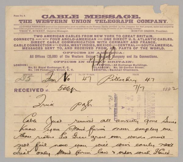由于霍姆斯特德的流血事件破坏了卡内基支持工人的名声,他试图与弗里克的决策保持距离,尽管在整个罢工期间他一直与弗里克保持着联系。“千万不要雇佣那些暴徒。在霍姆斯特德致命战役的第二天,卡内基给弗里克打了电报。