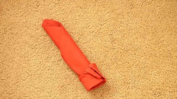 4 把餐巾翻过来。把餐巾翻过来,这样你就看不到面包卷了。的罗 最大的一侧应该离你最近。在这个阶段,餐巾看起来像一个有两个尾巴的三角形。