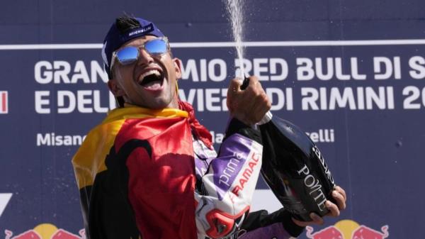 豪尔赫·马丁在圣马力诺大奖赛的米萨诺·阿德里亚蒂科从开始到结束驾驶他的普拉马克赛车杜卡迪完成了第二次冲刺和本赛季的主要比赛双冠王,并将弗朗西斯科·巴尼亚的冠军领先优势缩小到36分。