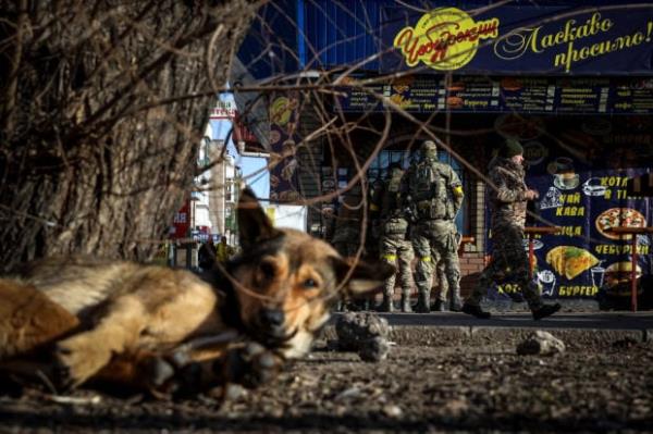 2022年12月1日,在俄罗斯入侵乌克兰期间,乌克兰士兵在乌克兰东部的Kostyantynivka购买食物。法新社