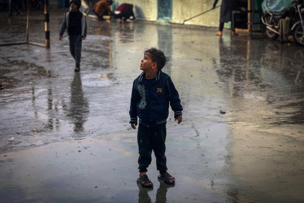 在加沙地带南部拉法,一名巴勒斯坦儿童在雨中行走。MAHMUD HAMS /法新社摄