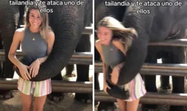 这名22岁的女孩在旅行中参观了大象,但她试图和大象合影的想法落空,让她脸红了。