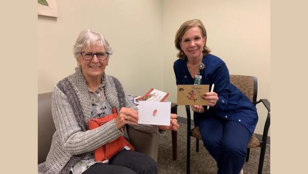 凯恩护士递给阿普尔盖特女士一张由当地退休社区居民制作的欢乐卡片。那里的人们希望乳腺癌患者知道,他们在想着他们,并祝愿他们身体健康。他们写了同情和鼓励的信息。