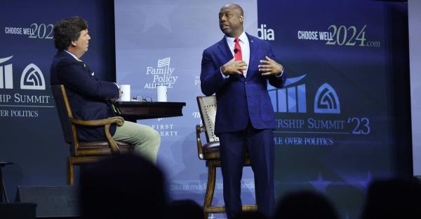 得梅因,爱荷华州——塔克·卡尔森不能再在福克斯新闻上传播他的反乌克兰、反疫苗和1月6日的观点,但在周五,他能够在通往爱荷华州共和党党团会议的关键候选人论坛上把他的阴谋论作为首要话题。
