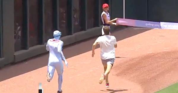 周四,一名即将战胜亚特兰大勇士队(Atlanta Braves)的短跑冠军“冰人”(the Freeze)的球迷吃了土。(请看下面的视频。)