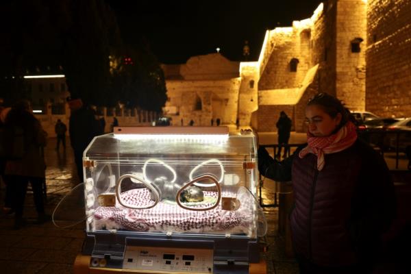 一件唤起战争悲剧的艺术品被安置在耶稣诞生教堂对面的地面上,取代了通常在那里的真人大小的耶稣诞生场景和巨大的圣诞树。