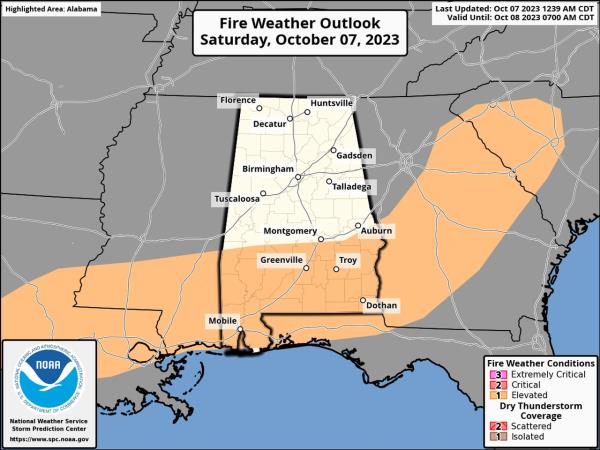 气象局还发布了周日阿拉巴马州南部和中部部分地区的火灾天气警报。火警天气监视站在预计会出现严重火警天气情况时发出。
